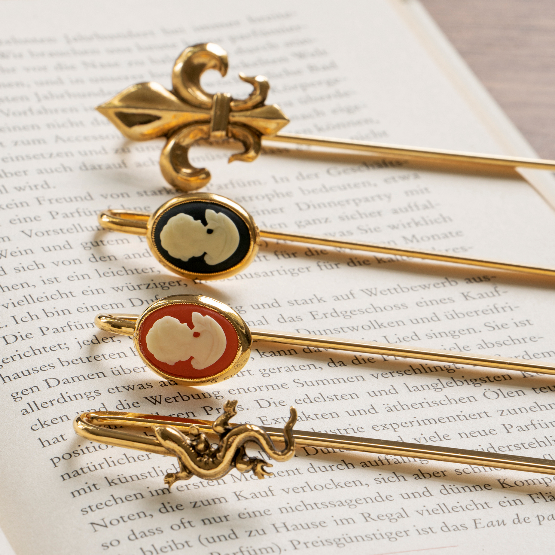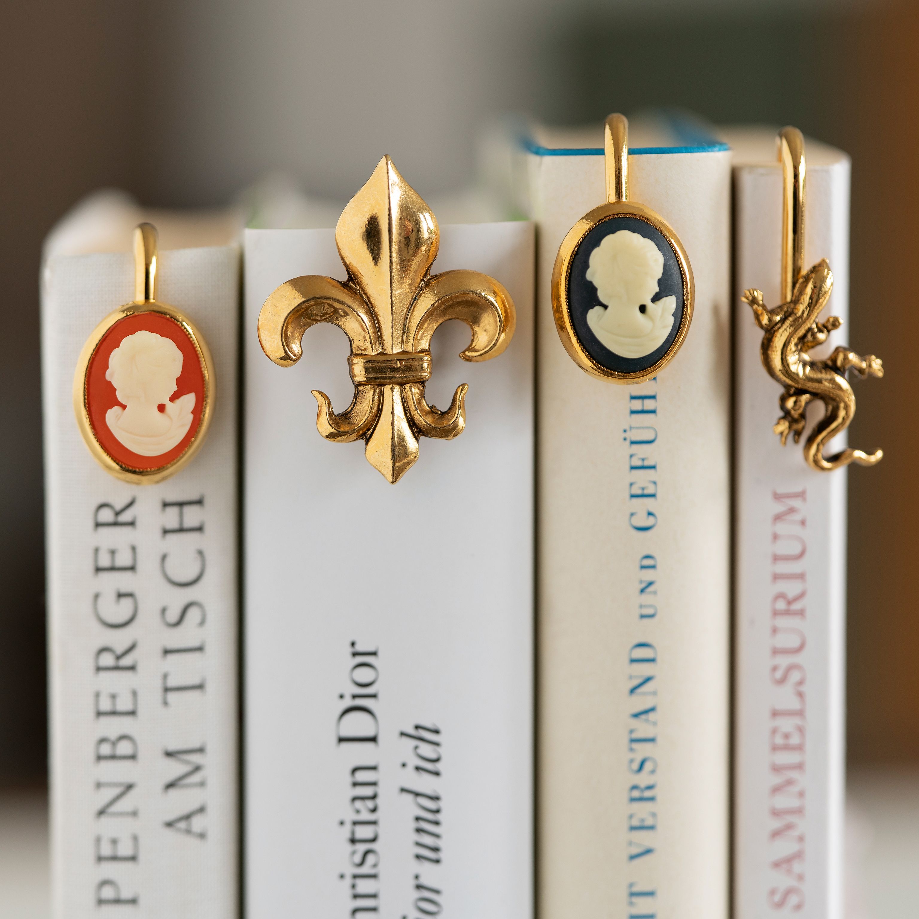 Lesezeichen aus gegossenem Messing, das entgratet, poliert und mit Zinn verlötet, und anschließend vergoldet und patiniert ist.